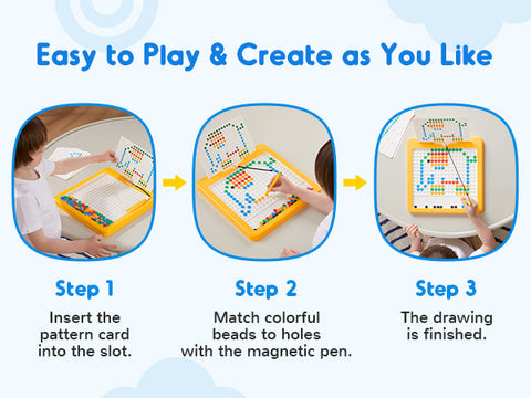 Insert the patterned card, and use the magnetic pen to pick up brightly colored beads into the corresponding positions. The variety of patterns captures children's attention and stimulates their creativity.